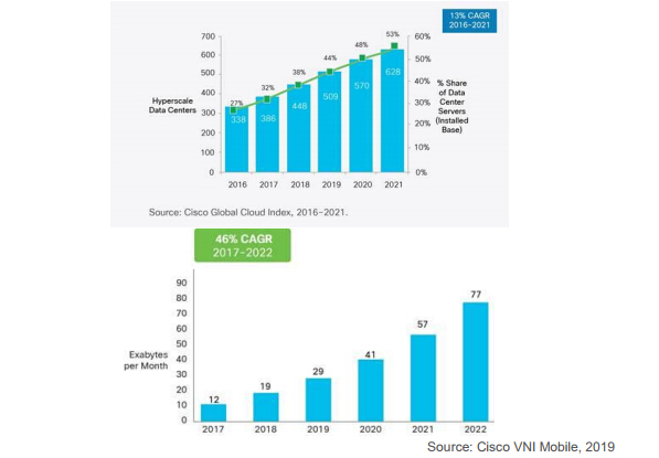 近年來無論是數據中心流量還是無線數據流量,均處于一個快速增長的趨勢,從而極大的拉動了高速寬帶的建設。全球超大數據中心的數量在2018年已經突破430個,據最新的思科全球云指數預測,到2021年預計會達到628個,年復合增長率達到13%。隨著各國5G牌照的發放和基礎建設,無線寬帶的流量也呈現爆發式增長,思科在2019年最新的白皮書中指出,年復合增長率達到驚人的46%。