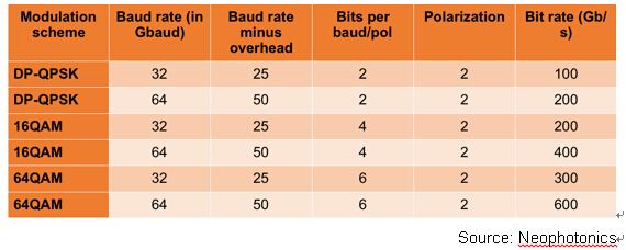 2)相干(Coherent)技術,在整個C波段,波長可調,且波長間隔可以到50GHz(0.4nm),可以形成多通道組合的SuperChannel。相干基于不同的調制技術,比如BPSK,QPSK, DP-QPSK, QAM等,如下表。相干技術不是本文討論重點,這里暫一筆帶過,以后做專題討論。