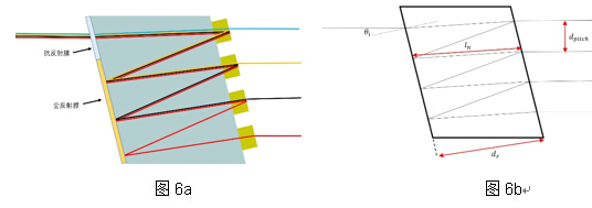 對于Z-block主要考慮的規格有入出射光角度、各束光間距及角度一致性,設計者可以用簡單的幾何光學來描述光的傳播方向,如果波長差異不大,計算中可以忽略不同波長造成的些微誤差。把Z-block的光路結構簡化成一個完美的平行四邊形如圖6b,光在Z-block中反射的一小段長度為